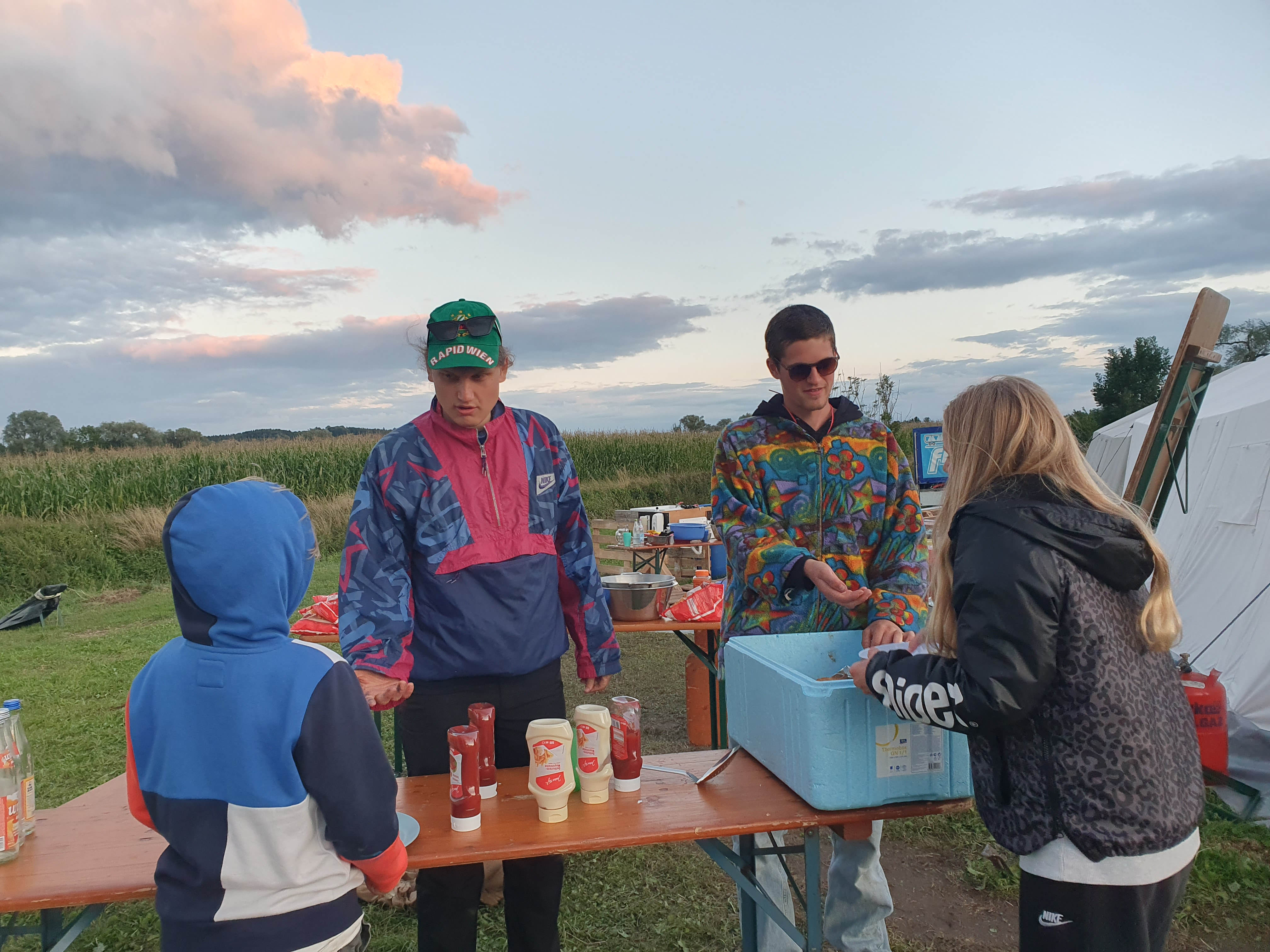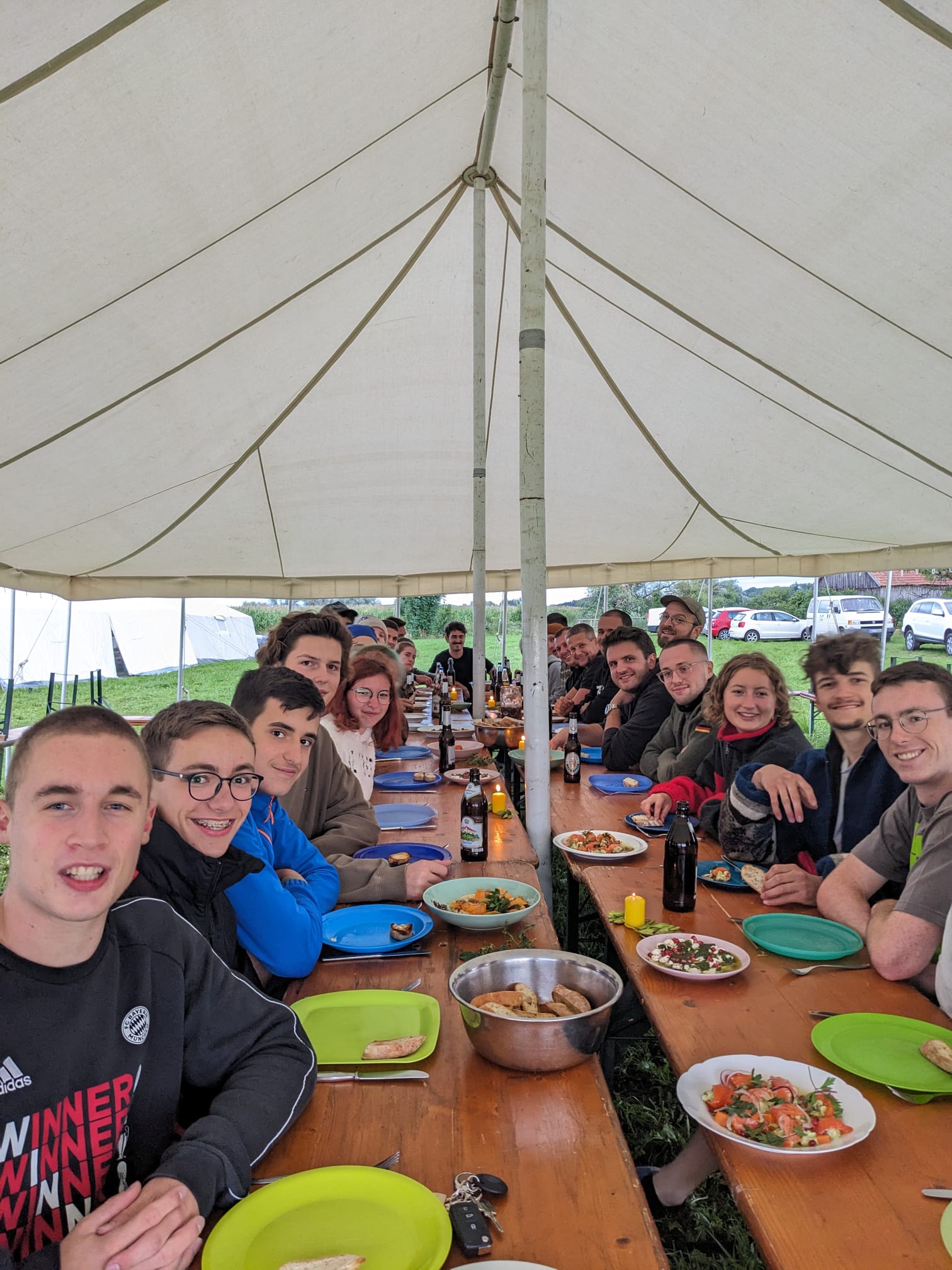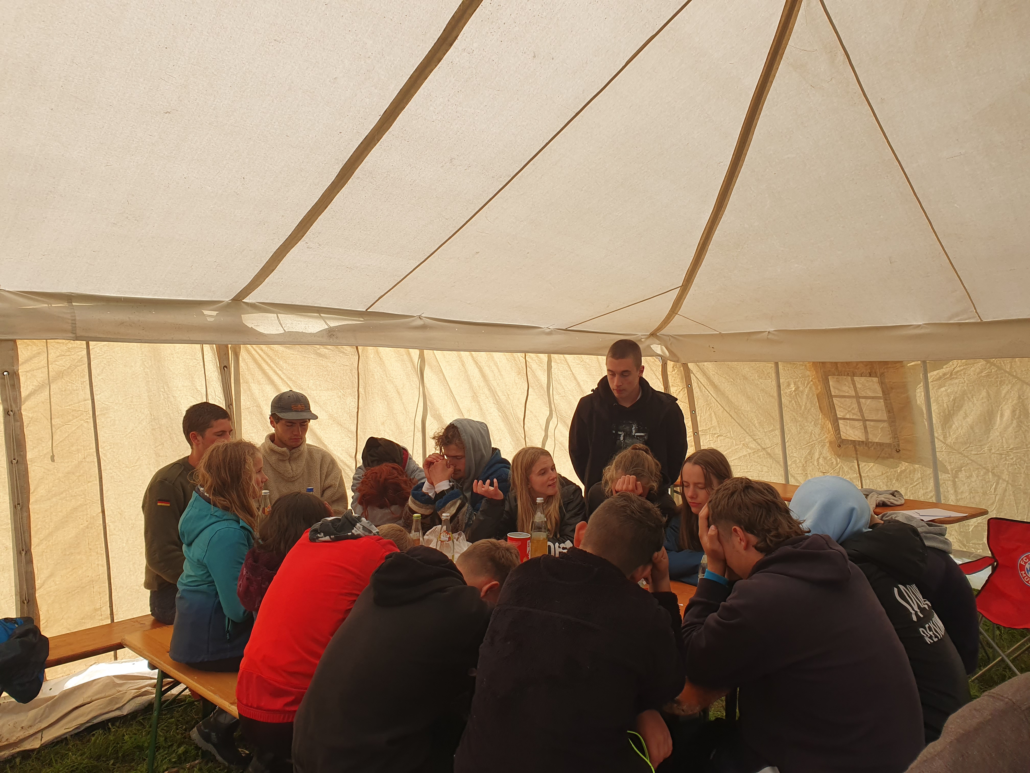 Nachmittags packten wir uns alle warm ein und suchten in unseren Aufenthaltszelten einen trockenen Unterschlupf. Dort wurde Werwolf, Karten und Dobble gespielt. Die Zuversicht, dass das Wetter in den nächsten Tagen wieder besser wird, lässt unserer schönen Zeltlagerstimmung nichts abgewinnen. Aktuell sind wohl die Luft- und Wassernation die stärksten Nationen...