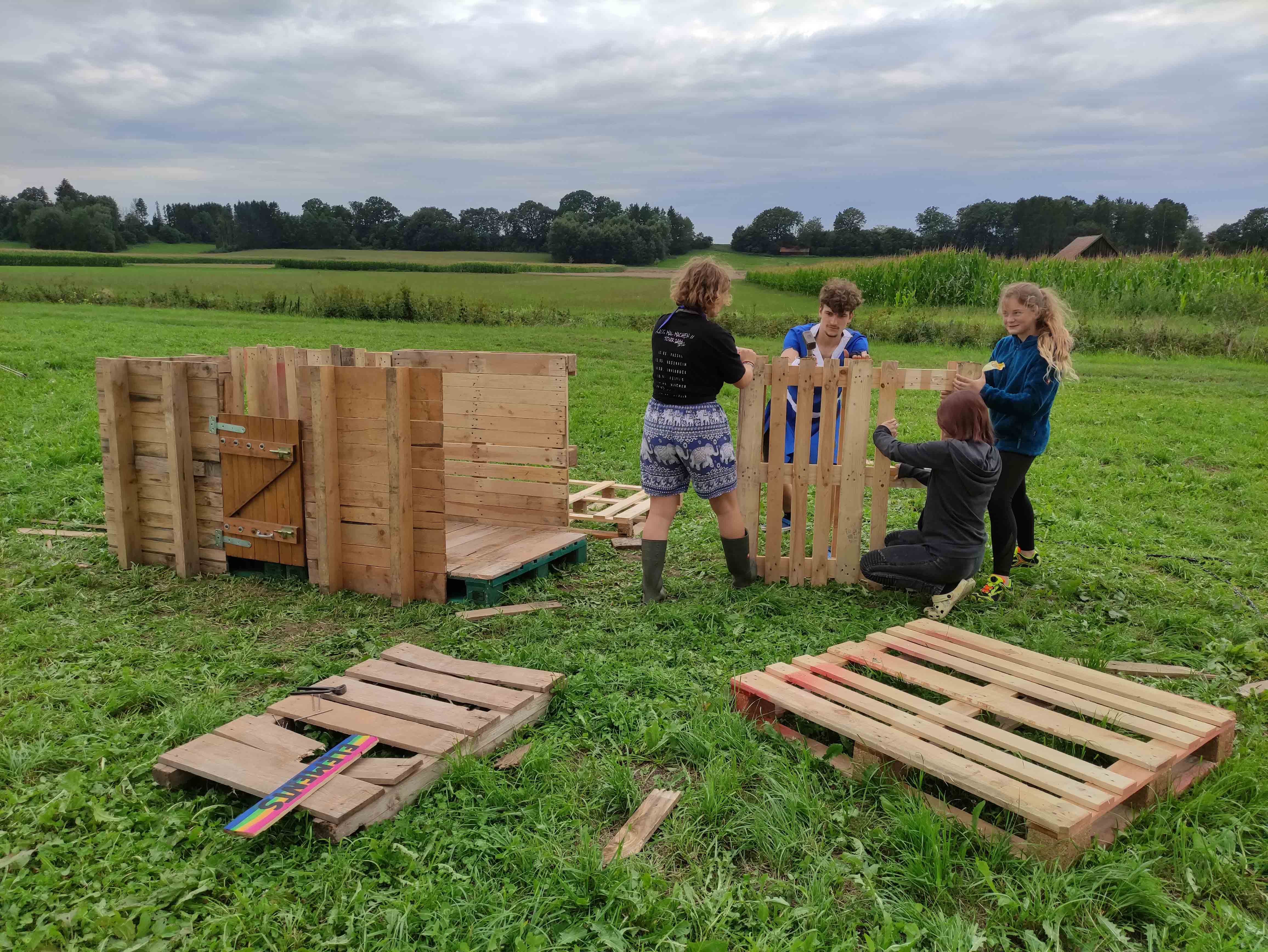 Der Banner wurde bemahlt und errichtet, die Infotafel gestaltet, der Esspresso-Wagen gebaut und bemalt und sogar ein Hühnerhaus gebaut, damit auch unsere fünf Hennen und der Hahn vor dem Regen geschützt sind.